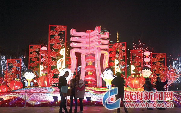 ????在五渚河公園南廣場入口處,一組以“福滿威海”為主題的燈光雕塑絢麗奪目。 通訊員 陳馨馨 攝