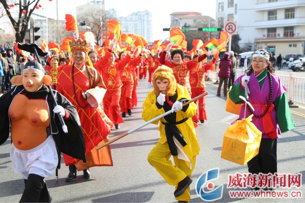 ????“太棒了,以前只能從電視上看到這么熱鬧的場(chǎng)面,今天在威海看到現(xiàn)場(chǎng)版的游藝活動(dòng),這才是真正的過年。”從廈門來威海度假的陳女士第一次看到這么熱鬧的場(chǎng)面,激動(dòng)得顧不上穿鞋,拿著手機(jī),套著酒店提供的拖鞋就跑了出來,一邊拍,一邊隨著現(xiàn)場(chǎng)的鼓點(diǎn)時(shí)不時(shí)扭兩下。