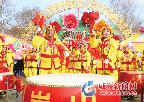 ????“咚…咚…咚…”2月8日上午9點30分, 伴著陣陣喝彩聲,近百名鑼鼓隊員跟隨鑼鼓方隊總指揮畢可強雙手的舞動,齊刷刷地抬起七彩鼓槌敲擊鼓面,曲調昂揚、旋律醇厚的《榮成大鼓》隨之奏響,吸引大批市民駐足觀看。