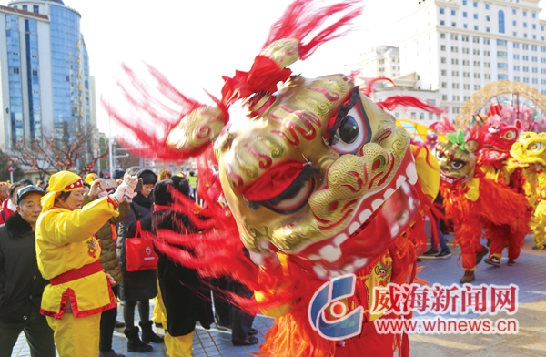 ????“太棒了,以前只能從電視上看到這么熱鬧的場面,今天在威海看到現場版的游藝活動。這才是真正的過大年。”從廈門來威海度假的陳女士第一次看到這么熱鬧的場面,拿著手機,穿著酒店提供的拖鞋就跑了出來,一邊拍,一邊隨著現場的鼓點時不時扭兩下。