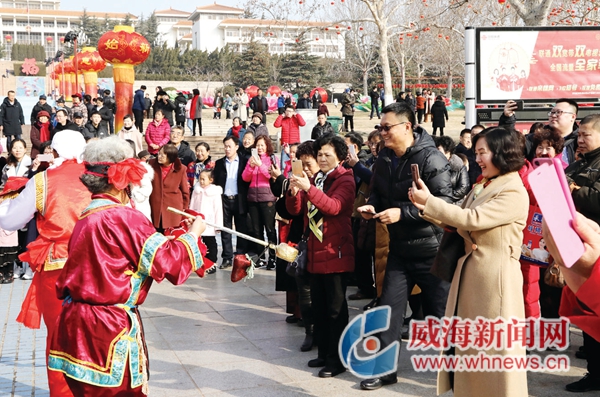 ????“你快看那大秧歌,扭得多好啊!”“這鑼鼓聲真帶勁!”“唱得好啊!”……2月5日上午9點30分,人民廣場人頭攢動,陣陣喝彩聲不時響起,環翠區2019年慶新春廣場文藝演出在這里舉行。秧歌、歌曲、舞蹈、腰鼓……精彩紛呈的節目紛紛登場,引來許多市民和游客駐足觀看。