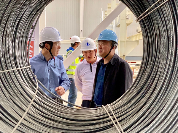 宋文(左一)正在與臨港區建設局工作人員交流。 陳曉偉 攝