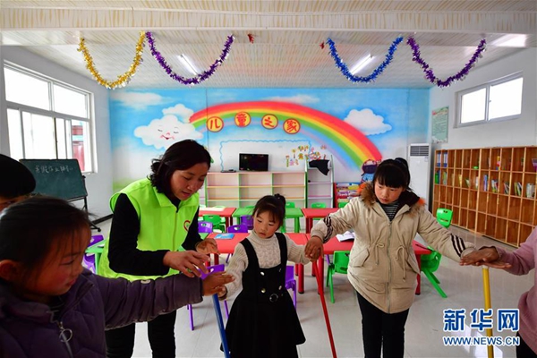 在河南蘭考惠安街道辦事處范樓村,社區義工指導孩子們在假期里做游戲(2019年1月23日攝)。新華社記者 馮大鵬 攝