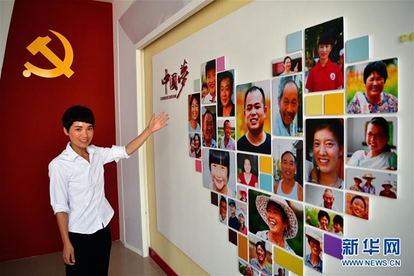 在河南蘭考東壩頭鄉張莊村,講解員介紹村委會內的“村民笑臉墻”(2018年6月21日攝)。新華社記者 馮大鵬 攝