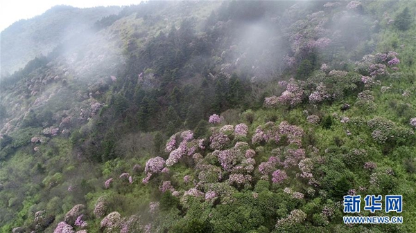 神農架神農頂景區盛開的高山杜鵑(5月13日無人機拍攝)。 新華社記者 杜華舉 攝