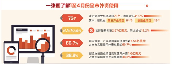“從前4個(gè)月統(tǒng)計(jì)數(shù)據(jù)來(lái)看,第三產(chǎn)業(yè)首次趕超第二產(chǎn)業(yè),成為外商投資新增長(zhǎng)點(diǎn)。”市商務(wù)局相關(guān)負(fù)責(zé)人介紹,前4個(gè)月,全市新設(shè)立第三產(chǎn)業(yè)項(xiàng)目54個(gè),占全市新設(shè)立外資項(xiàng)目數(shù)的72.0%;實(shí)際使用外資1.56億美元,占全市實(shí)際使用外資總額的60.7%。新設(shè)立制造業(yè)項(xiàng)目17個(gè),實(shí)際使用外資1.0億美元,占全市實(shí)際使用外資總額的38.8%。