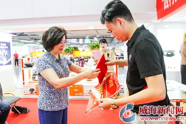 威海匯豐百大電器有限公司百大店總經理郭曉為優秀組織獎獲獎單位代表頒發證書。攝影:宮舉衛