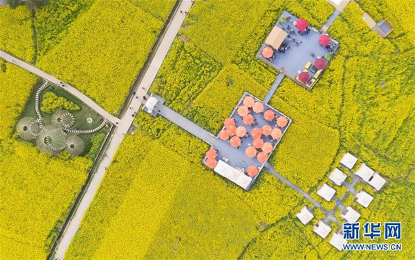 成都崇州市道明鎮竹藝村的景觀裝置和涼棚與油菜花相映成趣(3月20日無人機拍攝)。新華社記者 江宏景 攝