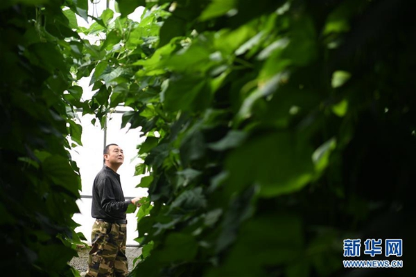 甘肅省酒泉市肅州區(qū)總寨鎮(zhèn)村民范立德在戈壁農(nóng)業(yè)產(chǎn)業(yè)園的日光溫室內(nèi)查看蔬菜生長(zhǎng)情況(2018年4月18日攝)。新華社記者 陳斌 攝