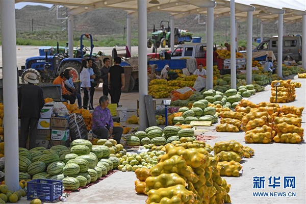 中寧縣喊叫水鄉的瓜農在集市上售賣硒砂瓜(2019年7月23日攝)。 新華社記者 馮開華 攝