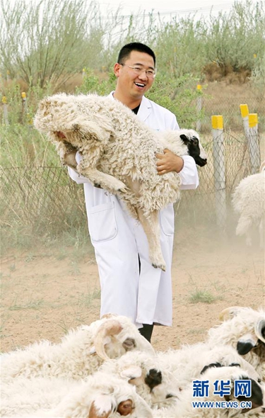 ????在寧夏鹽池縣寧鑫生態牧場,返鄉創業大學生馮歡在羊場里抱起一只灘羊,準備給工人講解灘羊養殖技術(2019年5月27日攝)。 新華社記者 鄭衛 攝