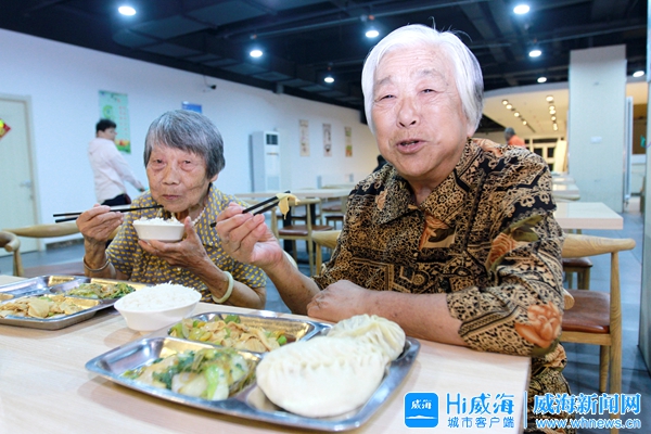 竹島街道養(yǎng)老服務(wù)中心食堂的飯菜質(zhì)量讓梁淑榮(右)和吳元貞很滿意。威海晚報記者 姚威 攝