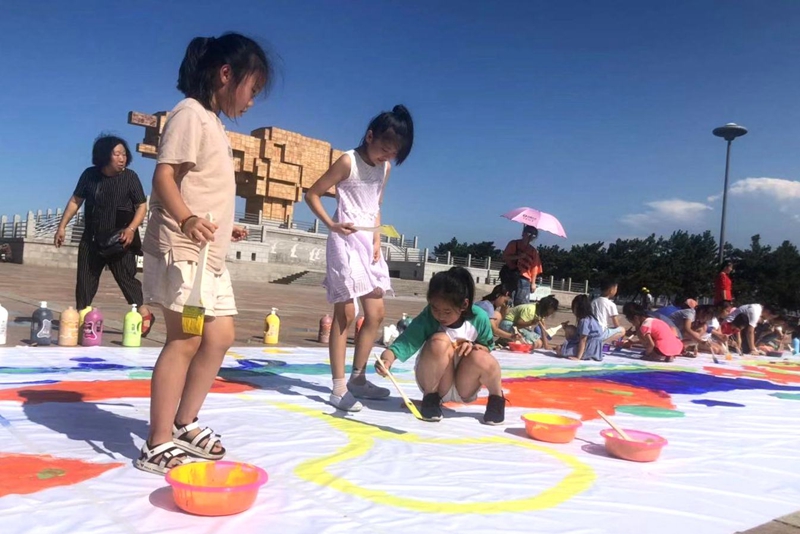 ????威海新聞網9月3日訊(記者 沈道遠)8月30日,2019威海國際藝術博覽會(以下簡稱威海藝博會)開幕式背景畫創作活動在威海公園舉行。威海藝博會開幕式藝術總監、著名油畫家靳春生攜手我市20余名兒童,以“夢想海洋”為主題,創作了長20米,寬3.4米的畫作。