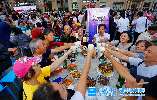 9月11日晚,乳山市銀灘一小區廣場上,上千居民正在舉杯慶祝中秋佳節。