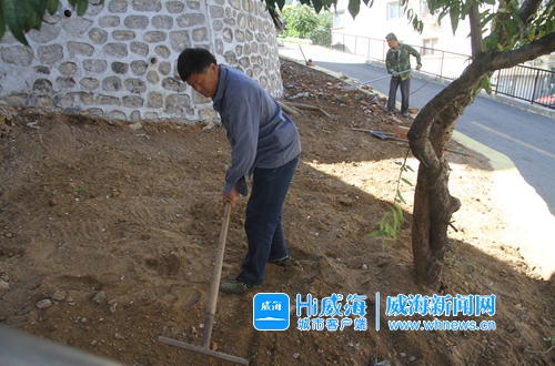 再往社區南邊走,在112號樓西側的一處綠化帶里,幾名工人正在清理泥土中的亂石和雜草,并平整土地。居民柳雙花恰好經過此處,她告訴記者,原先這里堆放著兩米多高的建筑垃圾,不過很快,這里就要種上花草樹木,成為一處真正意義上的綠化帶了。