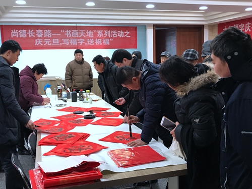????雖然天氣寒冷,但是長春路社區書畫室熱鬧非凡,威海市書畫家協會會員江樹泉老師正在教社區黨員們現場寫福字,大家積極發揮自己的才智,揮筆潑墨,一個個充滿吉祥的福字躍然紙上,寄托著人們對新一年的憧憬和向往,之后大家把自己寫的福字相互贈送,居民們喜上眉梢爭相領走屬于自己的福字。