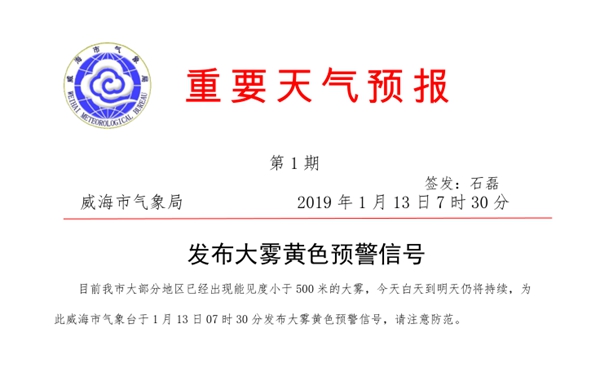 威海市氣象臺(tái)發(fā)布大霧黃色預(yù)警信號(hào)