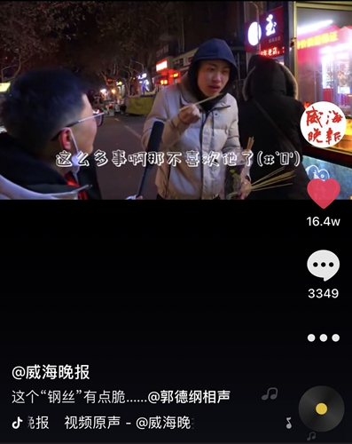 威海新聞網1月21日訊(記者 王春苗)17日,威海晚報抖音號推送的一條創意短視頻火啦!截至20日,該條閱讀量已超過770萬,收獲“小心心”16.4萬顆,評論3340多條。不僅如此,該微博話題還登上全國熱搜第15位,閱讀量超5千萬!