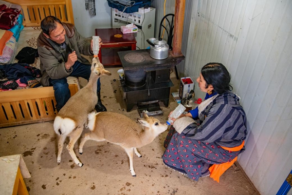 ????肉保、德措吉夫婦在照顧兩只藏原羚。 宋林繼攝