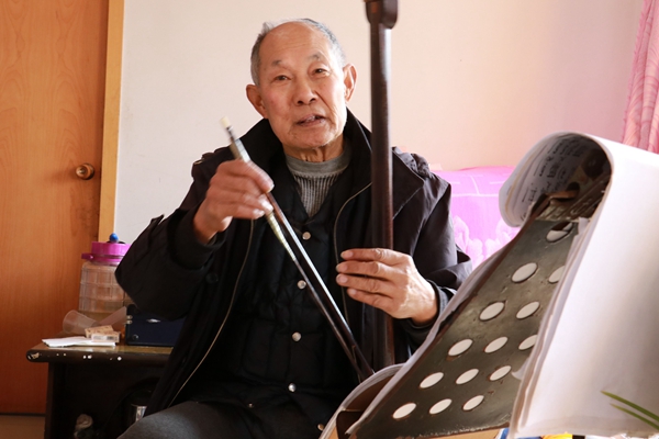 ????帶頭排練的就是李光平,他已經79歲。可一提到呂劇,仿佛整個人年輕了50歲。李光平自幼喜歡呂劇,12歲時隨村劇團演出拉琴伴奏,15歲開始創作。這兩樣愛好始終伴隨著李光平,并融入到社會活動中。