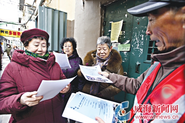 社區網格員向居民發放《威海市文明行為促進條例》宣傳禁燃禁放規定。記者 劉志鵬 攝