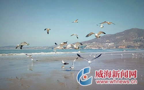 昨日我市晴空萬里,一群海鷗在金海灘海水浴場逐浪嬉戲。張夢潔 攝