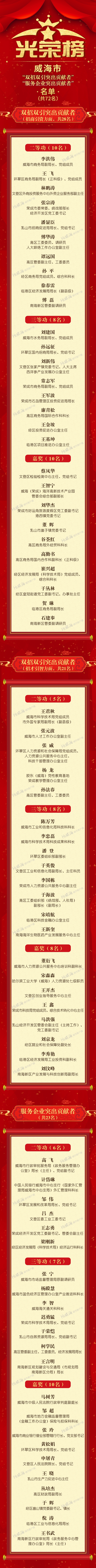 威海市“雙招雙引突出貢獻者”“服務企業突出貢獻者”名單