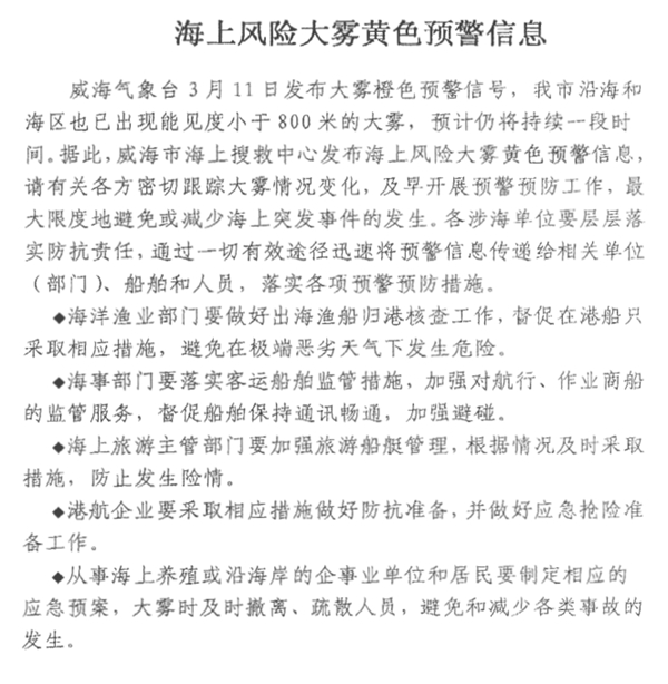 威海市氣象臺發(fā)布海上風(fēng)險大霧黃色預(yù)警信息