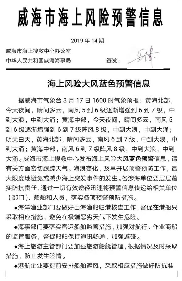 威海市氣象臺發布海上風險藍色預警信息