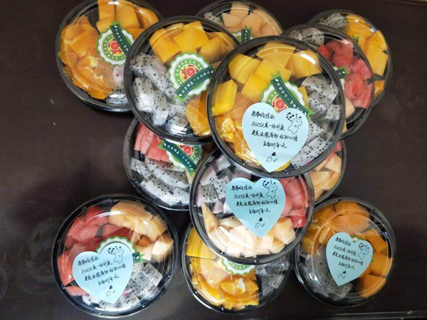根據訂單要求,他精心備好兩種“果切三拼”水果禮盒,包括哈密瓜、火龍果、西瓜、芒果、甜橙5種水果,一共12盒。裝好果盒,他在每個禮盒上貼了一份手寫紙條,上面寫著“愿帶給您的不僅僅是一份外賣,更是讓您有份好的心情去面對每一天”,借此表達對消防員們的敬意。隨后,這12個水果禮盒被外賣小哥送到華夏路消防中隊。