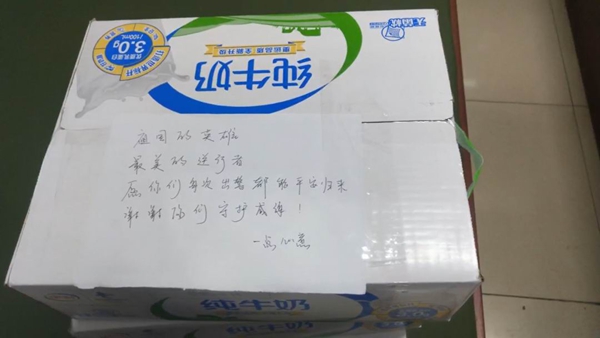 當日下午一點多,威海市消防支隊直屬特勤中隊同樣也收到一份愛心禮物,它是愛心市民通過外賣平臺送來的甜品和牛奶等,在牛奶外包裝上還附有一張署名為“一點心意”的紙條:“祖國的英雄,最美的逆行者,愿你們每次出警都能平安歸來,謝謝你們守護威海!”