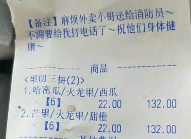 值班員仔細看了看外賣單,上面寫的收貨人是“威海經區消防大隊(華夏路中隊)消**先生”,外賣單的備注區上則寫著“麻煩外賣小哥送給消防員,不需要給我打電話了,祝他們身體健康”字樣。值班員豁然明白了這些外賣的意義。