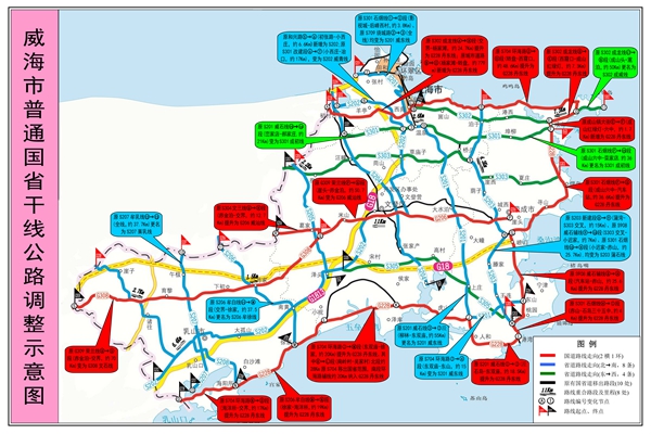????據市公路事業發展中心工作人員介紹,根據國家公路網命名編號調整工作要求,威海已于日前對全市的普通國省道進行命名編號調整工程施工,也就是說,有些大家耳熟能詳的公路名稱要更換?!奥肪W編號調整后,威海市境內普通國省道由原來的18條調整為15條。其中,國道由原來1條調整為3條,省道由原來17條調整為12條?!惫ぷ魅藛T解釋說。