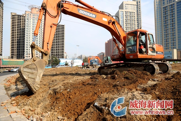 昨日,在改造工程現場,一臺挖掘機正在施工。威海晚報記者 陳婷 攝