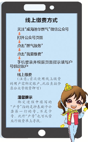 ????首次在公眾號上繳費的用戶需要綁定燃氣賬戶,即打開“威海港華燃氣”公眾號頁面后,點擊“燃氣服務”、“我要繳費”,之后手機快速登錄并根據頁面指示填寫戶號。需要注意的是,這里的“戶號”指的是抄表刷卡小票第一行的號,不是卡號。“戶號”也可從營業廳繳費單上尋找。燃氣賬戶注冊成功后,便可線上充值燃氣費,非常方便。