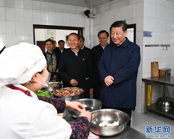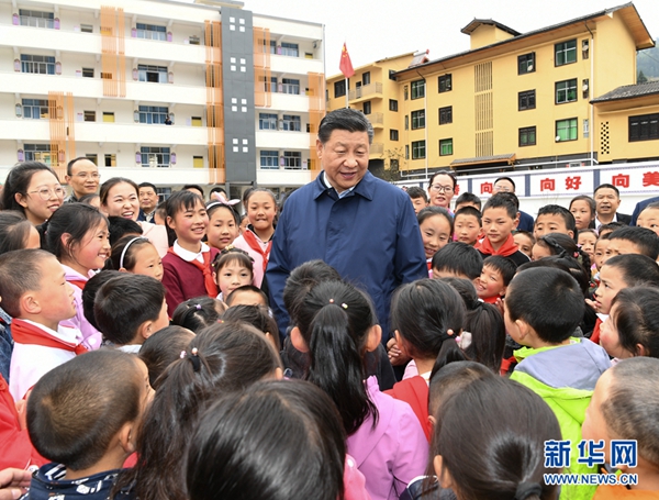 ????習近平首先來到中益鄉小學。學校操場上,小學生們正在開展課外文體活動。看到總書記來了,學生們圍攏過來,紛紛問習爺爺好,總書記高興地同大家交談,詢問他們學習和生活情況。中益鄉地處大山深山之中,群眾居住比較分散,孩子上學是個難題。習近平指出,“兩不愁三保障”,很重要的一條就是義務教育要有保障。再苦不能苦孩子,再窮不能窮教育。要保證貧困山區的孩子上學受教育,有一個幸福快樂的童年。習近平走進師生食堂,仔細察看餐廳、后廚,了解貧困學生餐費補貼和食品安全衛生情況。習近平囑咐學校和老師既要當好老師,又要當好臨時家長,把學生教好、管好。要把安全放在第一位,確保學生在學校學、住、吃都安全,讓家長們放心。他希望老師們扎根山區,獻身鄉村教育事業,為群眾脫貧貢獻一份力量。