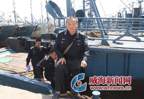 ????環翠區海洋發展局漁業綜合執法大隊漁政管理科負責人劉浩和同事登船執法檢查。