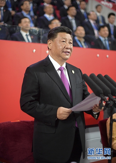 5月15日晚,國家主席習近平和夫人彭麗媛在北京國家體育場同出席亞洲文明對話大會的外方領導人夫婦共同出席亞洲文化嘉年華活動。這是習近平發表致辭。 新華社記者 李學仁 攝