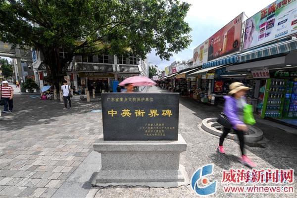 從深圳市鹽田區的沙頭角進入中英街街口,一家香港店鋪門口立著印有“中英街”字樣的黑白路牌,路牌下的方形界碑邊緣已被磨平棱角,依稀可以認出“中英地界”的字樣。