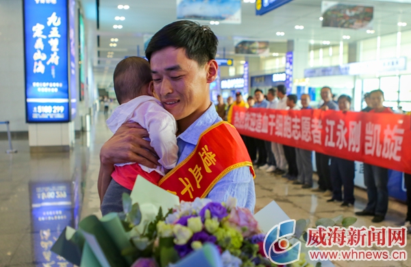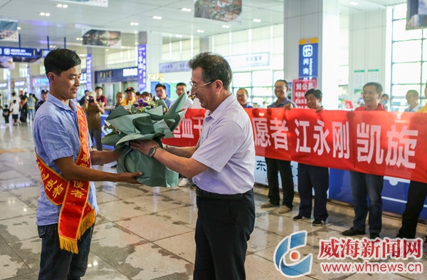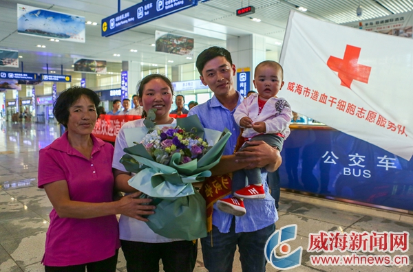 ?6月1日下午3點多,列車緩緩開進威海站,在山東省立醫院完成造血干細胞捐獻的江永剛回家了。“回來了!”“身體感覺怎么樣?”在出站口,江永剛接過單位領導送上的鮮花后,立即被妻兒、母親、同事及志愿者圍在中間,大家熱切地向他問候著……
