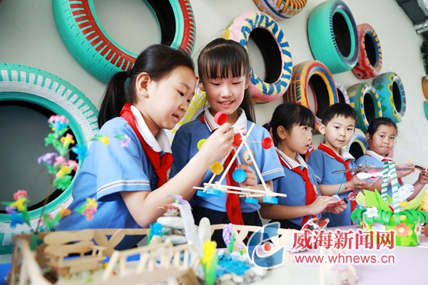6月5日,普陀路小學的同學們使用廢舊物品制作環保宣傳作品。