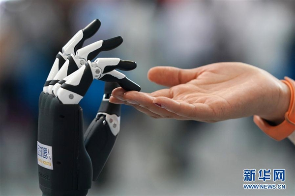 6月13日,參展商在演示一款人工智能機(jī)器人觸摸傳感單元的感知效果。 新華社記者 鞠煥宗 攝