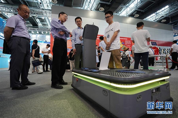 6月13日,幾位參觀者在參觀展出的視覺導(dǎo)航倉儲(chǔ)協(xié)作機(jī)器人。 新華社記者 鞠煥宗 攝