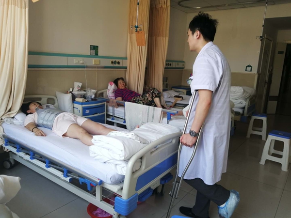 從早晨到現(xiàn)在一直在病房間穿梭,拄著雙拐,一瘸一拐的李艇,在5月底時不小心摔傷,將左腳摔至骨折。