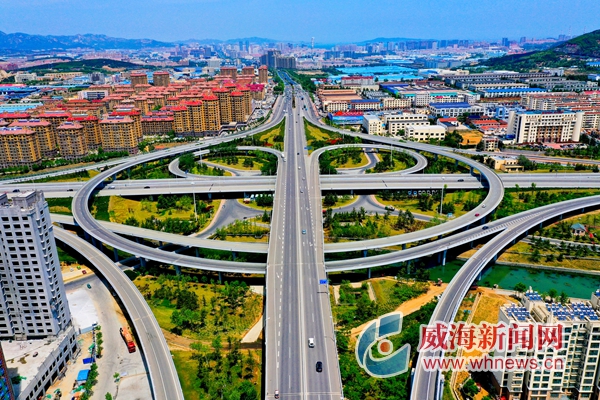 空中航拍江家寨立交橋。江家寨立交橋造型美觀,是威海自建市以來實施的標準最高、功能最全、投資最大的一項立交橋工程,實現(xiàn)了威青高速、威石路、石煙線三條主要干線的快速高效連接,打通了威海市區(qū)南出口的通行瓶頸。