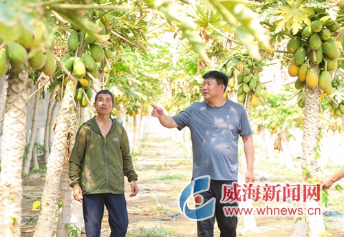 孫鵬超(右)與村民查看木瓜長勢。 記者 王彥博 攝
