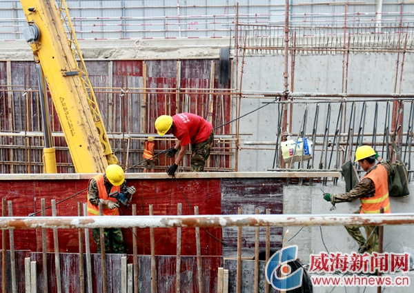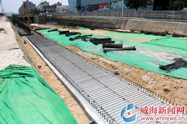 昨日上午,記者在海濱南路-上海路環島改造工程施工現場看到,工地上一派熱火朝天的景象。施工人員正在綁扎U型槽側墻的鋼筋及支設模板,下一步,側墻的混凝土將開始澆灌。