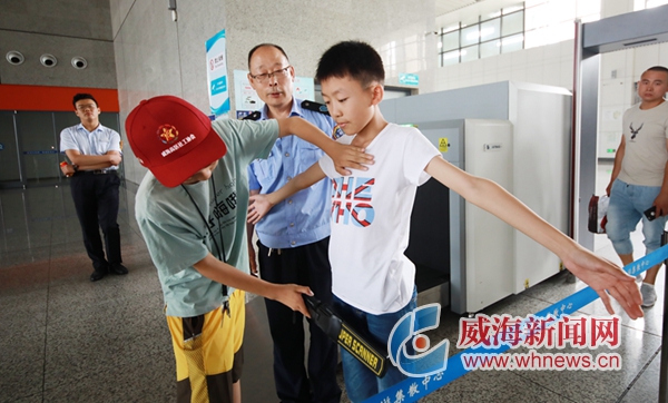 7月9日,在威海城鐵北站汽車站,同學(xué)們在體驗安檢掃描。