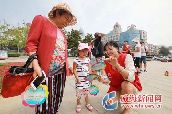7月25日,環(huán)翠樓街道的志愿者在向市民發(fā)放無廢城市宣傳扇。