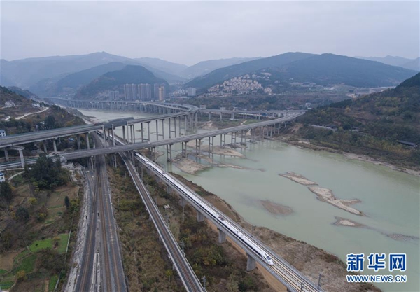????D4251次列車通過位于四川廣元市北郊的西成高鐵嘉陵江特大橋。嘉陵江水路、寶成鐵路、G5高速公路、G108國道、G212國道在這里“同臺亮相”(2017年12月6日無人機拍攝)。新華社記者 江宏景 攝